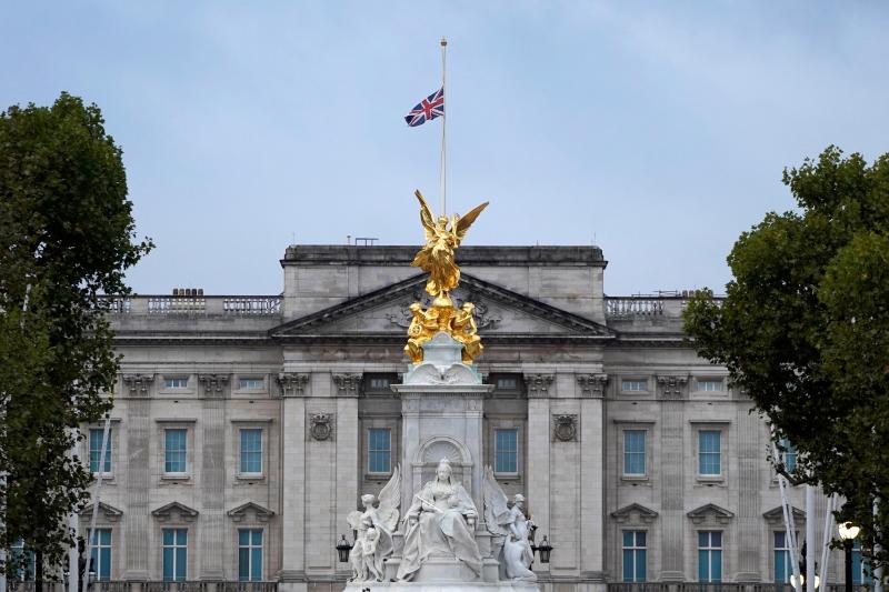 Na het overlijden van de Britse koningin Elizabeth II hangt donderdagavond de vlag halfstok boven Buckingham Palace.