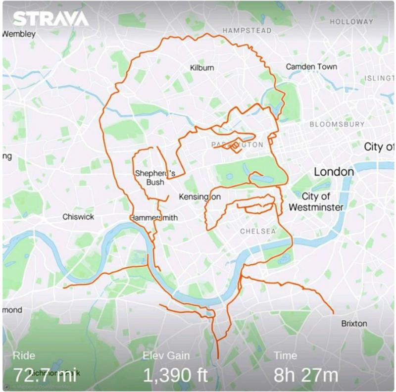 Zo’n drie maanden heeft de Brit Anthony Hoyte nodig gehad om de route uit te stippelen, maar afgelopen zaterdag heeft hij eindelijk 8 uur en 27 minuten lang door Londen kunnen fietsen zodat hij een mooie tekening van een man met een snor kon maken via de GPS- en sportapp Strava.