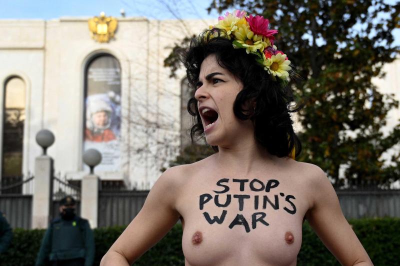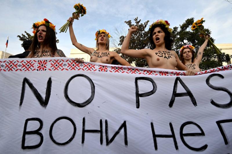 Een vijftal vrouwen van de bekende protestgroep betoogde vandaag aan de Russische ambassade in de Spaanse hoofdstad Madrid. Zoals gewoonlijk deden ze dat halfnaakt. Op hun borst stond «Vrede voor Oekraïne» en «Stop Poetins oorlog» geschreven, en op de enorm spandoek die ze vasthielden viel er «Ze zullen er niet geraken» te lezen.