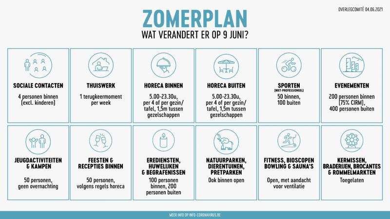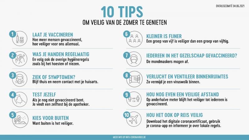 Er werd ook een overzicht gegeven met 10 basisregels om «veilig van de zomer te genieten» (zie foto onderaan dit artikel). Daarin wordt onder meer opgeroepen om je te laten vaccineren, je zo weinig mogelijk in grote groepen te begeven en de hygiëneregels goed te blijven opvolgen.