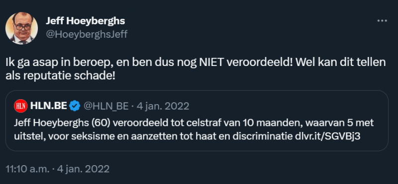Volgens Hoeyberghs verdediging was er enkel uiting van een mening en geen sprake van aanzetten tot haat of geweld. . Het Gentse hof van beroep volgt daarin voor het grootste deel van de uitspraken, maar oordeelde dat drie passages wel strafbaar zijn en legde enkel 1.000 euro geldboete op.