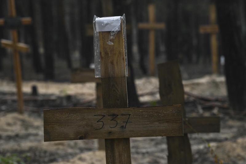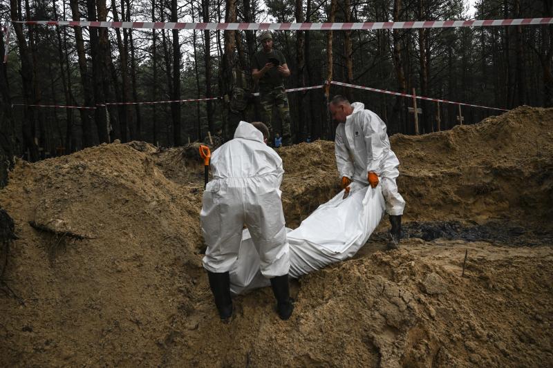 «Dit is slechts een van de massagraven die bij Izjoem zijn ontdekt», aldus Podoljak nog op Twitter. «Maandenlang hebben terreur, geweld, marteling en massamoord geheerst in de bezette gebieden.»