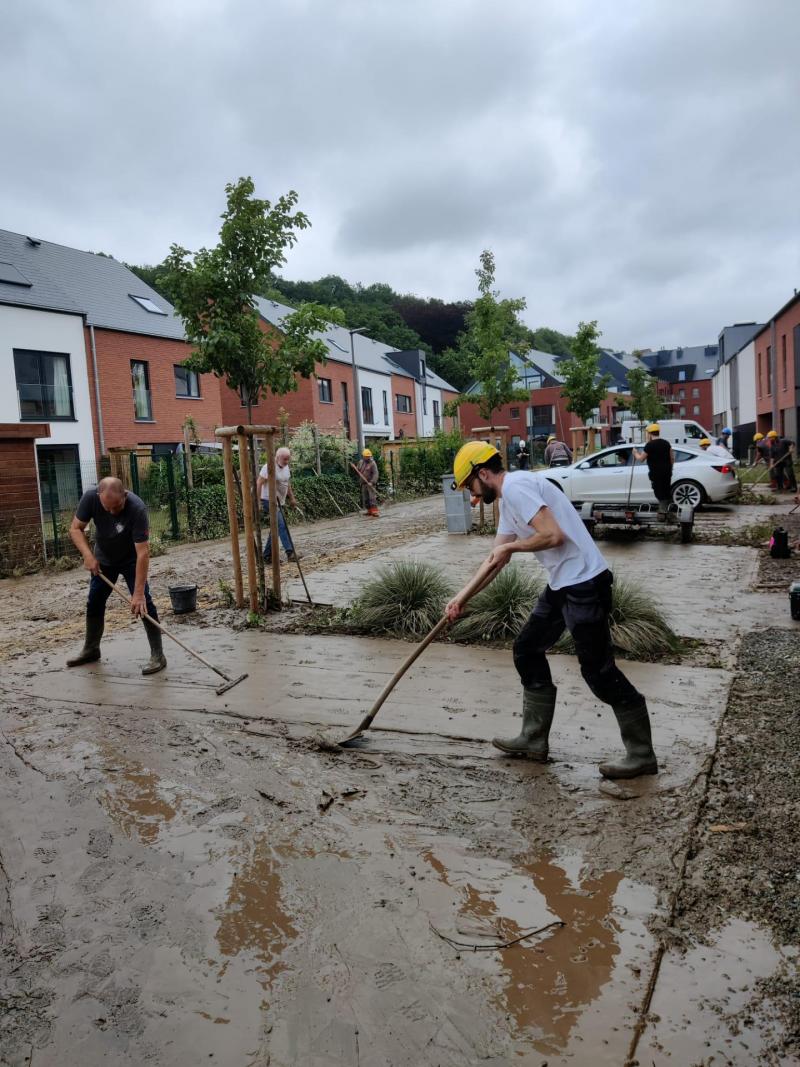 Thomas en zijn partner zaten vast in hun eigen huis, op de eerste verdieping. «De hele nacht hoorden we de meubels in huis ronddobberen en de glazen breken. Het was behoorlijk afschuwelijk.» De volgende dag, toen ze eenmaal bevrijd waren, konden ze de schade opmeten en beginnen met op te ruimen. «Het water steeg meer dan een meter in de huizen en veroorzaakte enorme schade. We kwamen samen met de buren, stroopten de mouwen op en hielpen elkaar. Er kwamen mensen aanlopen met kruiwagens, schoppen en trekkers: scoutsleden, maar ook inwoners die geen schade hadden geleden», vervolgt Thomas. «Er was echt veel solidariteit. Mensen kwamen van ver om ons te helpen. Dat doet echt iets. Al die hulp was een lichtpuntje in de duisternis.»