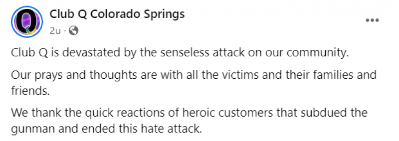 Club Q spreekt in een mededeling van een doelgerichte «haataanval op onze gemeenschap». De dader werd door moedige klanten overmeesterd, aldus nog de nachtclub.