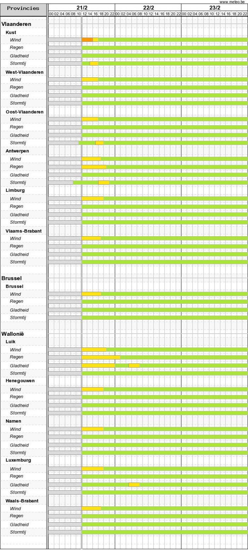 Dudley en Eunice hebben we intussen achter de rug, maar momenteel raast storm Franklin nog door ons land. En het ergste moet deze namiddag nog komen, met intense buien en kans op onweer of korrelhagel. Dat gaat gepaard met rukwinden tussen 80 en 100 km/u in het binnenland en tussen 100 en 110 km/u aan de kust. «Het venijn zin in de staart. Er trekt opnieuw een pittige buienlijn over ons land, maar tegen vanavond of vannacht belooft het rustiger te worden. Er is dus opnieuw kans op schade, al zal het meeste dat los hing de afgelopen dagen wel al weggewaaid zijn», vertelt Jill Peeters in Het Laatste Nieuws.