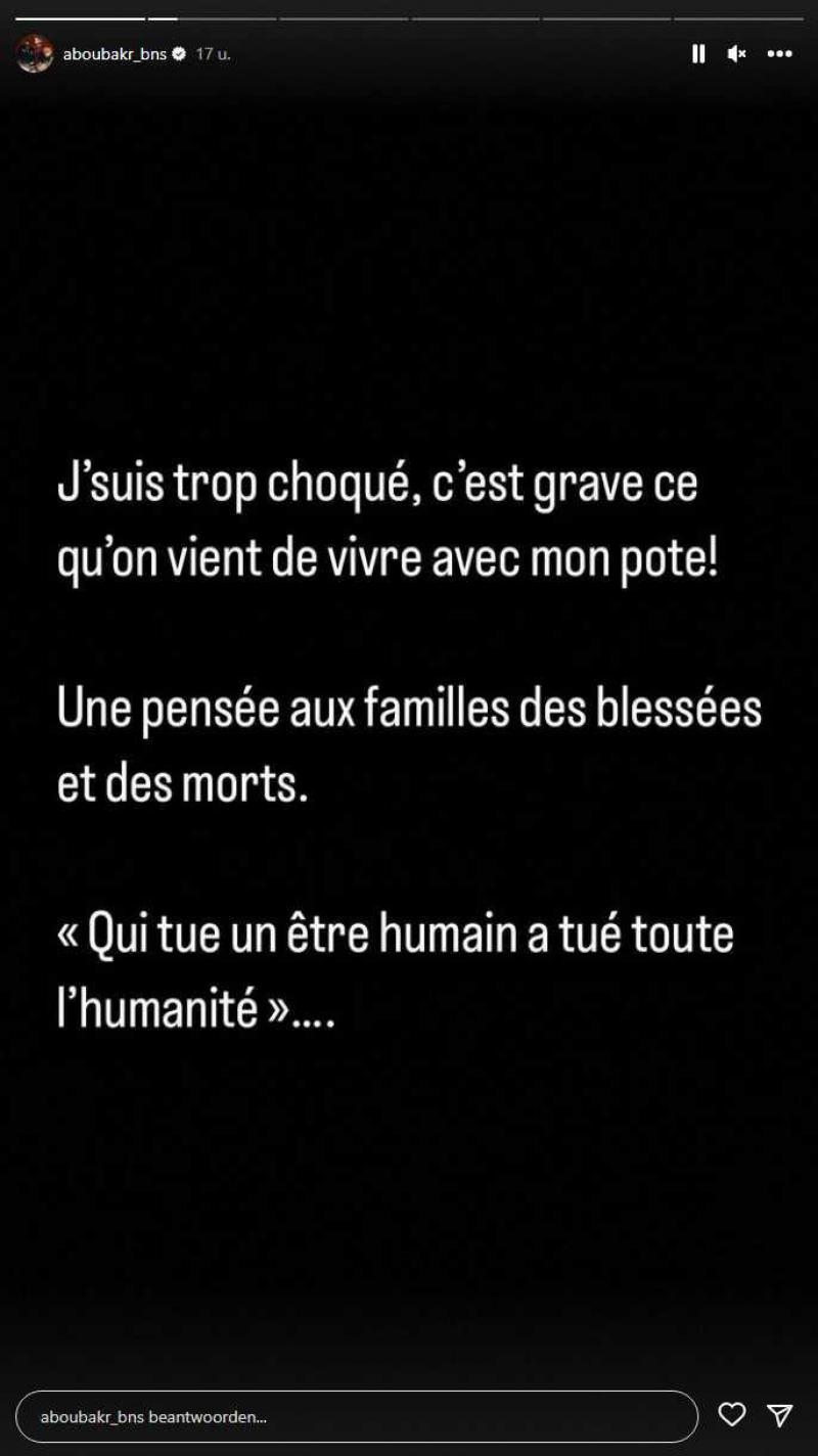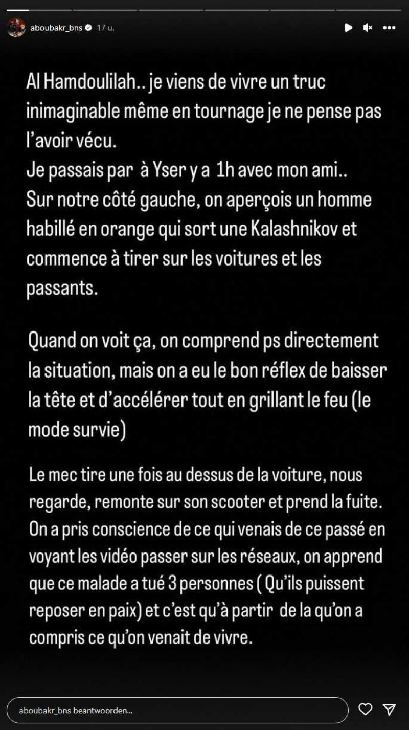 Bensaihi zat op dat moment met een vriend in de auto. Op Instagram vertelt hij wat er zich precies afspeelde. «De in het oranje geklede man stond amper zes meter van onze auto, haalde een geweer tevoorschijn en begon op auto’s en voorbijgangers te schieten. We wisten op dat moment niet wat er aan de hand was, maar we hadden de juiste reflex om te bukken en gas te geven terwijl we door het rode licht reden (overlevingsmodus). De man vuurde een schot af vlak boven onze auto, keek ons aan, stapte op zijn scooter en reed weg. Pas nadat we op sociale media zagen wat er gebeurd was, drong het volledig tot ons door. Ik ben enorm geschokt. Mijn gedachten gaan uit naar de families van de slachtoffers», schrijft hij.