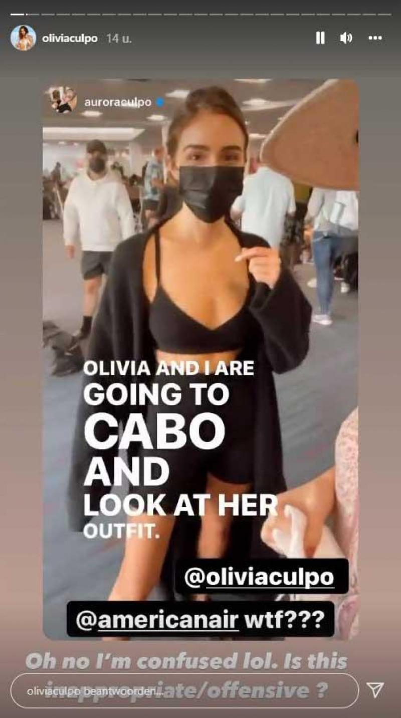 Olivia Culpo en haar zus Aurora planden onlangs een trip naar de Mexicaanse plaats Cabo San Lucas. In de luchthaven werd Olivia echter aangesproken op haar outfit, een topje en een korte sportbroek. Een medewerker van American Airlines vond haar outfit te bloot en vroeg haar om er een T-shirt over te trekken.