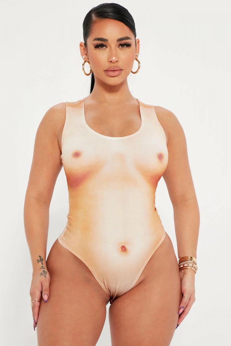 De Amerikaanse online kledingwinkel Fashion Nova verkoopt voor 21,95 euro een badpak dat zo ontworpen is dat het lijkt alsof je in je blootje rondloopt of zwemt. Het 30-jarige model Kamilla Almeida toont op Instagram hoe het eruitziet in het zwembad. «Zei er iemand naaktzwemmen?», staat erbij geschreven.