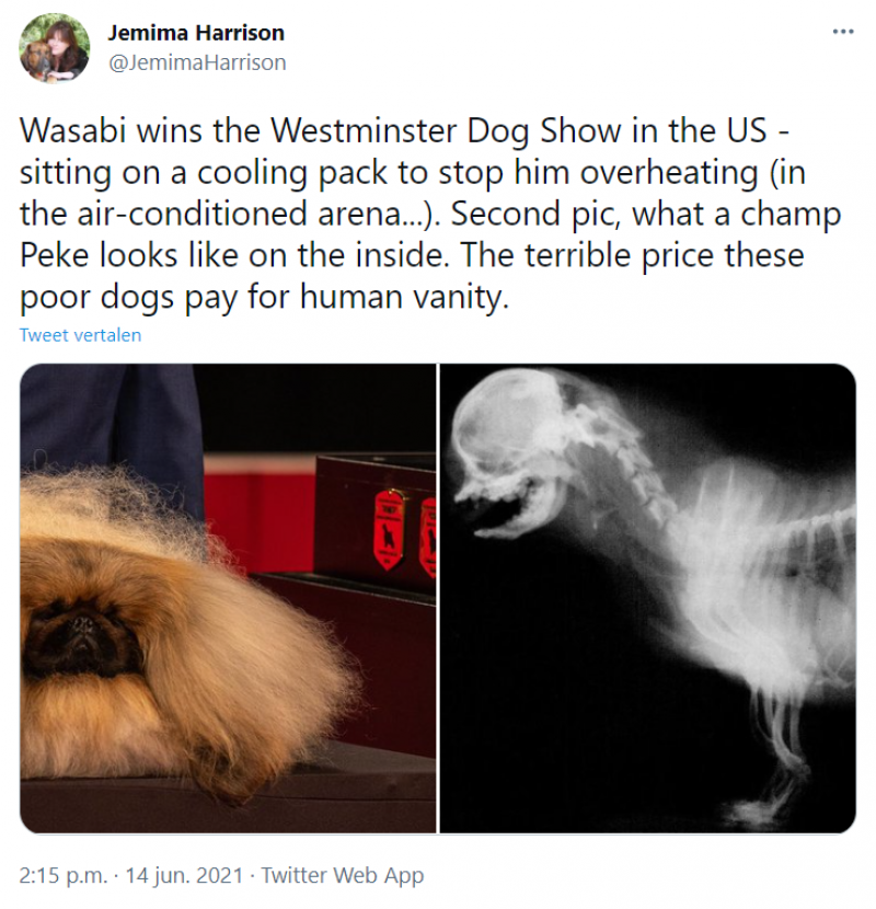 Zo wijst iemand op het feit dat de gefokte pekinees op een coolpad moest gaan liggen om oververhitting tegen te gaan, terwijl de arena nochtans voorzien was van airconditioning. Daarnaast plaatst de Twitteraar een foto van het misvormde skelet van pekinezen. «Deze arme honden betalen een verschrikkelijke prijs voor menselijke ijdelheid», klinkt het. «Ik zou willen dat we geen honden zouden fokken met zulke onnatuurlijke en schadelijke eigenschappen. We hebben de macht om dit te veranderen», reageert iemand anders. Of nog: «Dit soort honden fokken en houden zou illegaal moeten zijn. Het is een object om te dragen, om op een kussen te zetten, om mooi te maken. Wat voor soort huisdier is dat? Hij wil gewoon goed kunnen ademen.»