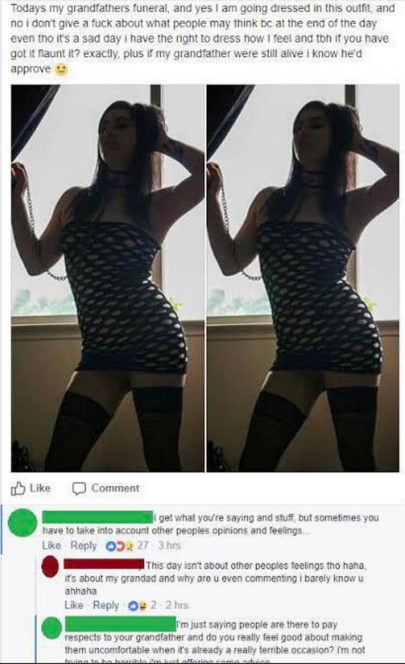 De anonieme vrouw deelde een foto van de bewuste outfit op Facebook. Ze draagt een kort kleedje in netstof en lange netkousen. Zelf vindt ze de outfit niet ongepast. «Vandaag is het de begrafenis van mijn opa en ja, ik ga ernaartoe in deze outfit. Nee, ik trek me niets aan van wat anderen ervan denken, want uiteindelijk is het een triestige dag en heb ik het recht om me te kleden zoals ik me voel. En om eerlijk te zijn: wat je hebt, moet je laten zien. Bovendien: mocht mijn opa nog leven, dan zou hij de outfit oké gevonden hebben», schrijft ze erbij.