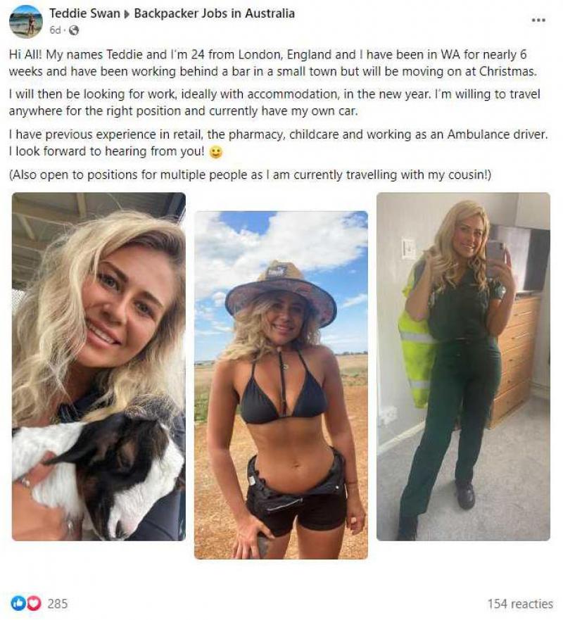 Teddie Swan heeft de afgelopen twee maanden rondgetrokken in Australië. Om haar reis te kunnen betalen, werkt ze in een café. Rond de feestdagen wil ze echter naar een andere plek verhuizen en dus heeft ze een nieuwe job nodig. Daarom deed de 24-jarige blondine uit Londen een oproep in de Facebookgroep ‘Backpacker Jobs in Australia’. Ze voegde er drie foto’s aan toe, waaronder eentje in bikini.