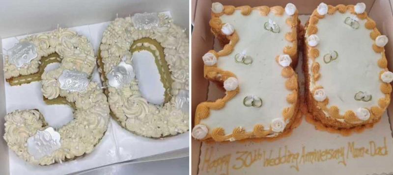 Megan Turner wilde haar ouders onlangs verrassen met hun parelen bruiloft, oftewel hun 30ste huwelijksverjaardag. Ze bestelde een taart in de vorm van het getal 30 met hier en daar wat felicitaties erop. Om de bakker te inspireren, stuurde ze hem een foto van wat ze in gedachten had.