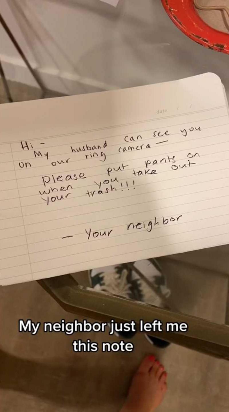 De vrouw, ene Emily, durft in een luie bui weleens haar broek niet aan te trekken als ze de vuilzakken buiten moet gaan zetten. Dat was lange tijd zonder gevolgen, tot nu. Ze trof immers een boodschap aan van haar buurvrouw. «Hoi! Mijn man kan je zien op onze beveiligingscamera. Doe alsjeblieft een broek aan wanneer je het vuilnis buitenzet!», klonk het.