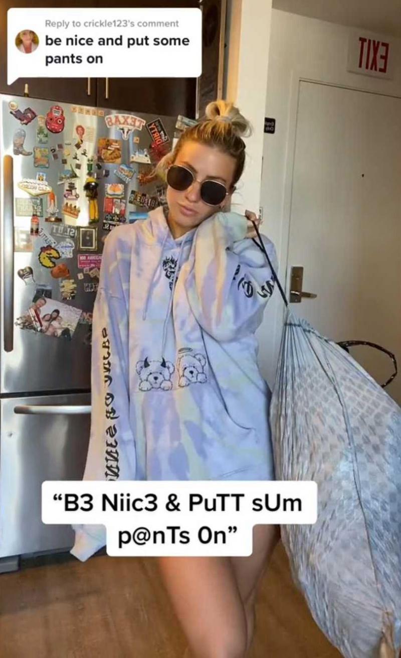 Emily deelde de boodschap op TikTok en maakt duidelijk dat ze zich er niet door laat intimideren. «Meh, ik ga het zo houden, schat. Geniet ervan!», schrijft ze bij de video. In een update deelt ze zelfs de ‘broekloze’ outfit die ze toen droeg.