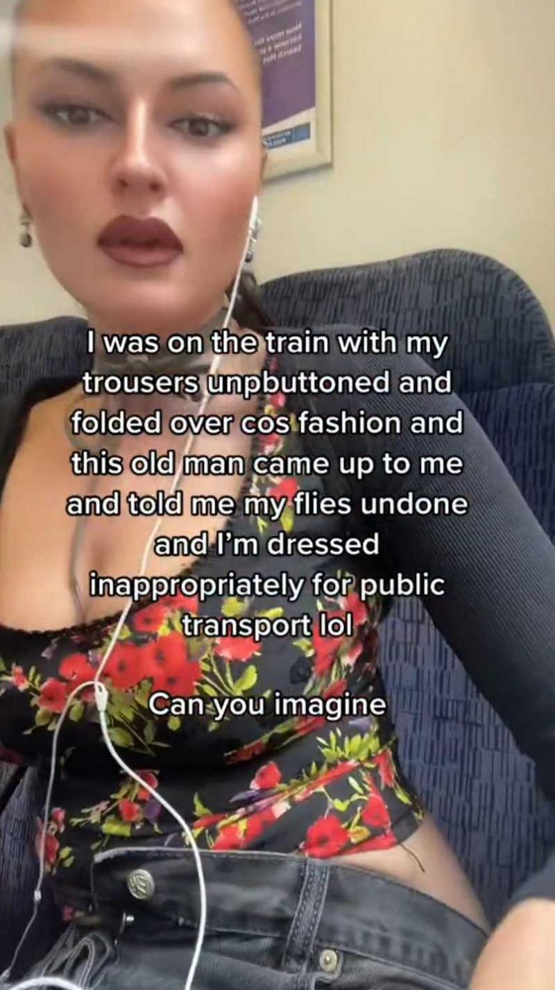 De vrouw, ene Kitty, nam onlangs de trein en droeg een topje en een zwarte broek, die ze op een opvallende manier aanhad. «Ik zat op de trein en mijn broek was losgeknoopt, want dat is in de mode. Een oude man sprak me aan en zei dat mijn broek openstond en dat mijn outfit ongepast was voor op het openbaar vervoer. Kun je je voorstellen?», zucht ze in een video op TikTok.