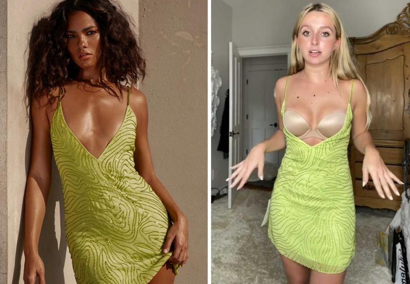 De vrouw, die zich @shoppahollyc noemt op TikTok, bestelde een lichtgroene jurk van 215 euro bij de Britse online kledingwinkel Rat & Boa. Het kleedje heeft vooraan een behoorlijke uitsnijding, maar op papier zou het haar borsten netjes moeten wegwerken.