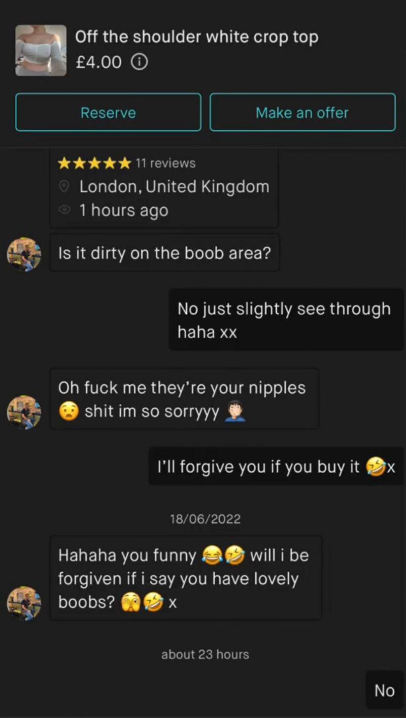 De vrouw, ene Grace, maakte een foto van zichzelf terwijl ze het topje droeg en zette het op Vinted te koop voor 4 pond (4,6 euro). Een man vroeg haar meer info over het bewuste topje. «Zit er vuil op het borstgedeelte?», stuurde hij haar. «Nee, gewoon een beetje doorzichtig, haha», antwoordde Grace. «Ah, dat zijn je tepels?! Sorry», reageerde de man. «Ik vergeef het je als je het koopt», zei Grace. «Haha, je bent grappig. Vergeef je me het als ik zeg dat je prachtige borsten hebt?», antwoordde de man. «Nee», beëindigde Grace het gesprek.