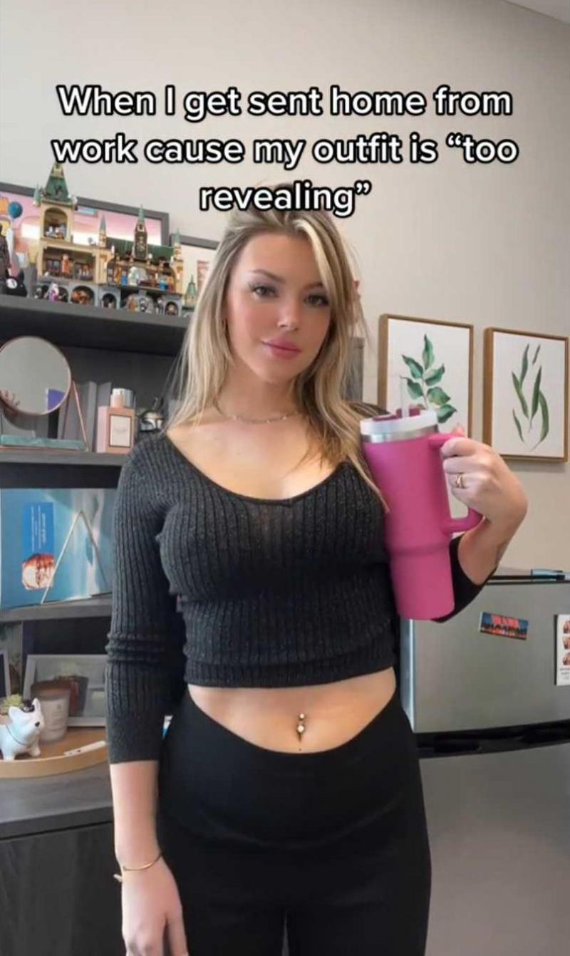 Ze was het echter niet met haar baas eens, dus deelde ze haar verontwaardiging met haar TikTok-volgers. «Wanneer ik van het werk naar huis gestuurd word omdat mijn outfit ‘te weinig verhullend’ is. Dit is gewoon een navel», schrijft ze erbij. «Mag ik nog leven?», voegt ze er nog aan toe.