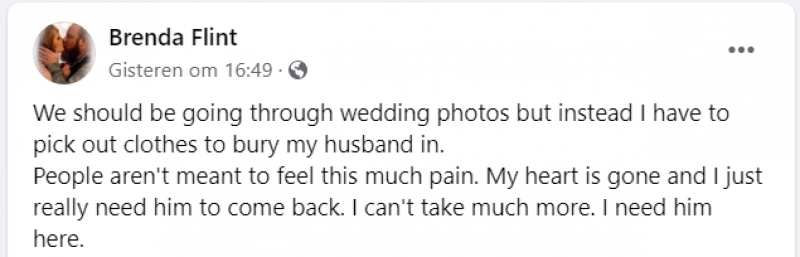 «We zouden onze trouwfoto’s aan het bekijken moeten zijn, maar in plaats daarvan moet ik kleren uitzoeken om mijn man in te begraven», schreef Brenda Flint op Facebook. «Mensen horen niet zoveel pijn te voelen. Mijn hart is weg en hij moet eigenlijk gewoon terugkomen.»