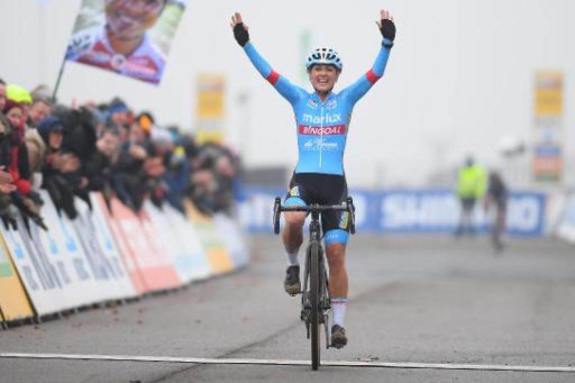 Denise Betsema heeft vandaag haar eerste Wereldbeker bij de vrouwen gewonnen. De Nederlandse van Marlux-Bingoal haalde het in Koksijde voor de Britse Nikki Brammeier en Annemarie Worst (Steylaerts-777). Sanne Cant werd zevende en Marianne Vos twaalfde, maar de Nederlandse behoudt wel haar leiderstrui in de Wereldbeker. Marianne Vos, voor het eerst weer in het veld na het EK in Rosmalen begin november, schoot het snelst uit de startblokken en nam een groot deel van de eerste ronde voor zich. Daarna volgde een grote groep met Annemarie Worst, Ellen Van Loy, Ceylin Alvarado, Nikki Brammeier en Sanne Cant. Vos zakte naar het eind van die eerste ronde een beetje weg, Brammeier nam het commando over en bij de eerste passage aan de finish telden we drie leiders: de Britse, Sanne Cant en Annemarie Worst. Alvarado volgde op vier seconden, een groepje met Compton op 10 seconden. Vos was teruggevallen tot op 22 seconden en daar volgden ook Denise Betsema, Nash en enkele anderen.