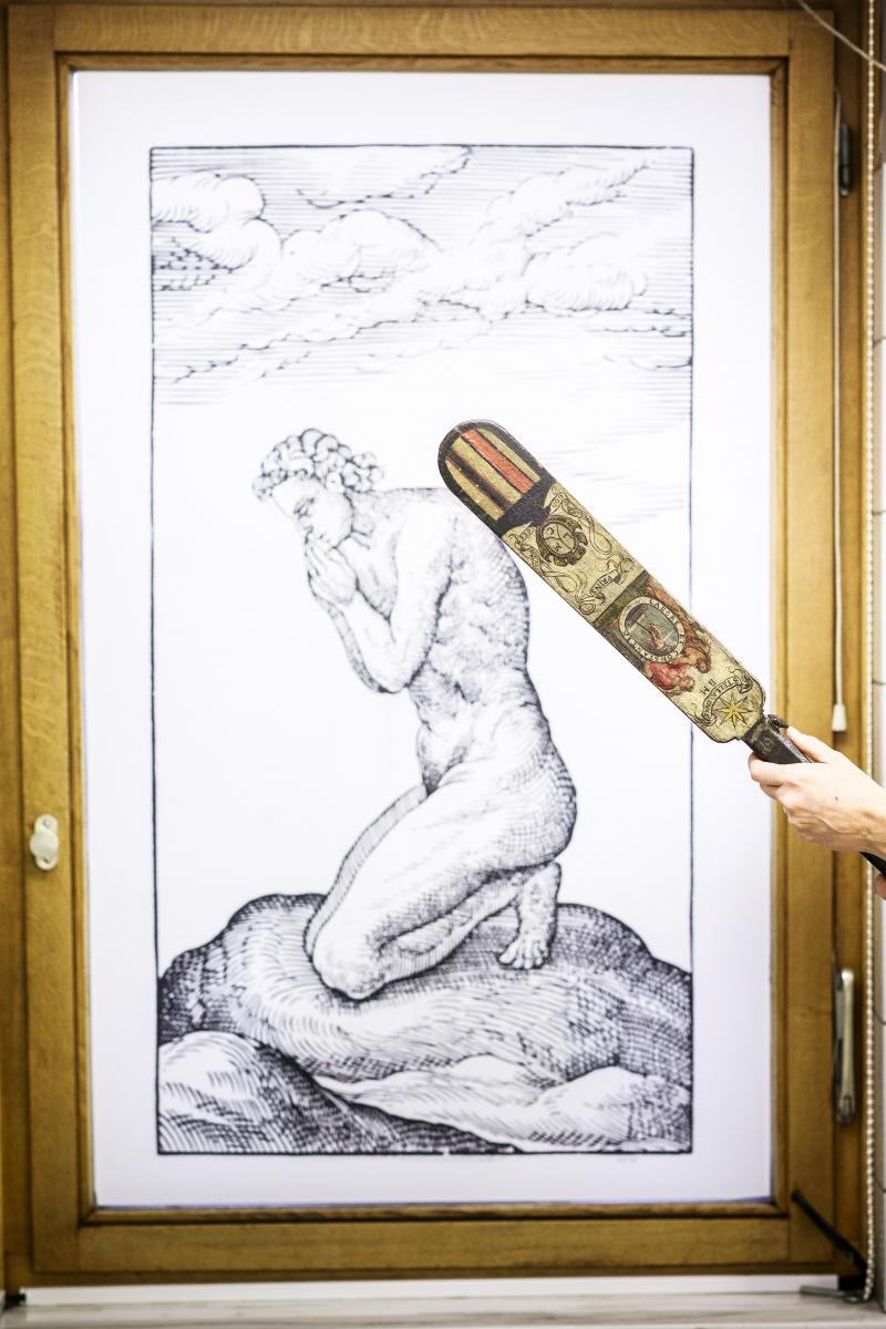 Onderzoek in het archief brengt raad. In de zeventiende eeuw komt niemand de wereldberoemde drukkerij van Plantijn als kandidaat-drukker of -letterzetters zomaar binnen. Nee, er is een proeftijd van een jaar en zes weken. Wie die periode succesvol doorloopt, ondergaat daarna een overvloedig met bier gemarineerde ontgroenings- of doopceremonie, geleid door de prins van de Kapel van de drukkerij. Met deze brits als symbolisch strafwerktuig in de hoofdrol. Tijdens het zingen van het dooplied slaan de dooppeters de nieuwe gezellen met de brits, en krijgen ze water over zich heen.