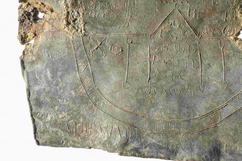 Gaius Julius Viator... Deze onbekende Romeinse staatsburger uit Tongeren moet ooit iemand hebben beledigd, bestolen of pijn gedaan. We weten niet wie, maar op dit loden tablet wordt Gaius in elk geval vervloekt. Onderaan staat zijn naam. We kennen deze tabletten en hun rare formules, woorden en tekens van elders in het Romeinse Rijk. Er circuleerden handboeken met magische symbolen om iemand te vervloeken. Wat ze hier precies betekenen, ontgaat ons. «Iedereen is bang om door zwarte magie te worden behekst.» Dat schrijft de Romeinse geleerde Plinius in de jaren 70, ook de tijd waarin dit voor België unieke tablet is gemaakt. Plinius’ uitspraak geeft aan hoe intens magie bij de Romeinen leefde. Bovenaan zie je twee doorboringen met resten van nagels. Waarschijnlijk heeft de vervloeker het tablet vastgemaakt aan Gaius’ huis, op een onopvallende plek. Wat voor lelijks hij of zij Gaius toewenste, weten we niet. Op andere tabletten is dat blindheid, doofheid, onvruchtbaarheid of zelfs de dood. Je zou voor minder bang zijn.