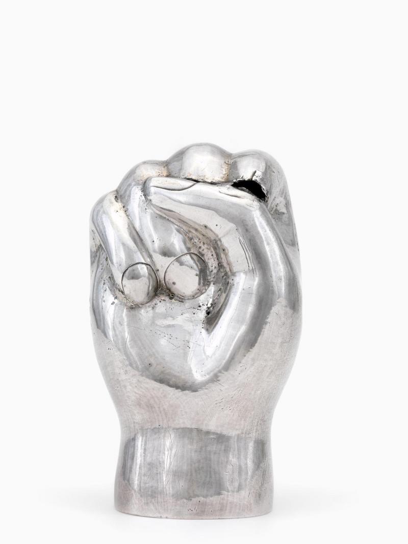 Vandaag doen gebalde vuisten denken aan protestmarsen, solidariteit of een cocktail van woede en verzet. Maar de tijden veranderen. Deze blinkende zilveren vuist uit het begin van de vijftiende eeuw maakte deel uit van een ... boete. Wie in die tijd schuldig werd bevonden aan smaad of, erger, rebellie tegenover gezagsdragers, kreeg het zwaar te verduren, op alle vlakken. Om te beginnen moest de veroordeelde een halve kilo aan zilver betalen, uit eigen zak. Daarna werd een vuist als deze gemaakt. Die werd op een publieke plek geplaatst, voorzien van een plakkaat met daarop de naam en misdaad van de veroordeelde. Auw! Aansluitend moest hij ook publiekelijk vergiffenis vragen, een fysieke straf ondergaan en − als kers op de taart − nog een som geld ophoesten. Wie het heel erg bont had gemaakt kon daarenboven ook nog verbannen worden. Deze vuist is dus een duidelijke waarschuwing voor de gemeenschap; bezint eer ge begint.