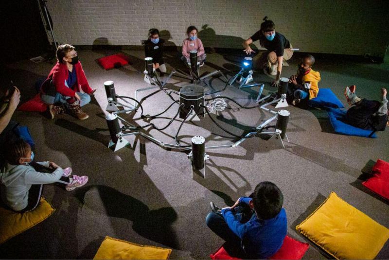 Muzieklabyrinth Foto K. MaruszakAntwerpen - De hele kerstvakantie lang is hetpaleis in Antwerpen omgebouwd tot een grote muzikale speeltuin met allerlei muziek- en klankinstallaties: aankomen mag! Er zijn muzikale robots, een keuken met swingende blenders en strijkijzers die muziek maken, een veld vol speakers en instrumenten die je nog nooit in je leven zag. Een gids neemt jullie mee op ontdekking en natuurlijk mag je ook zelf muziek maken. Maak een beat door hard (of net heel zachtjes) te dansen, componeer met licht of dirigeer een orkest door chocomousse te eten. Een hele belevenis!