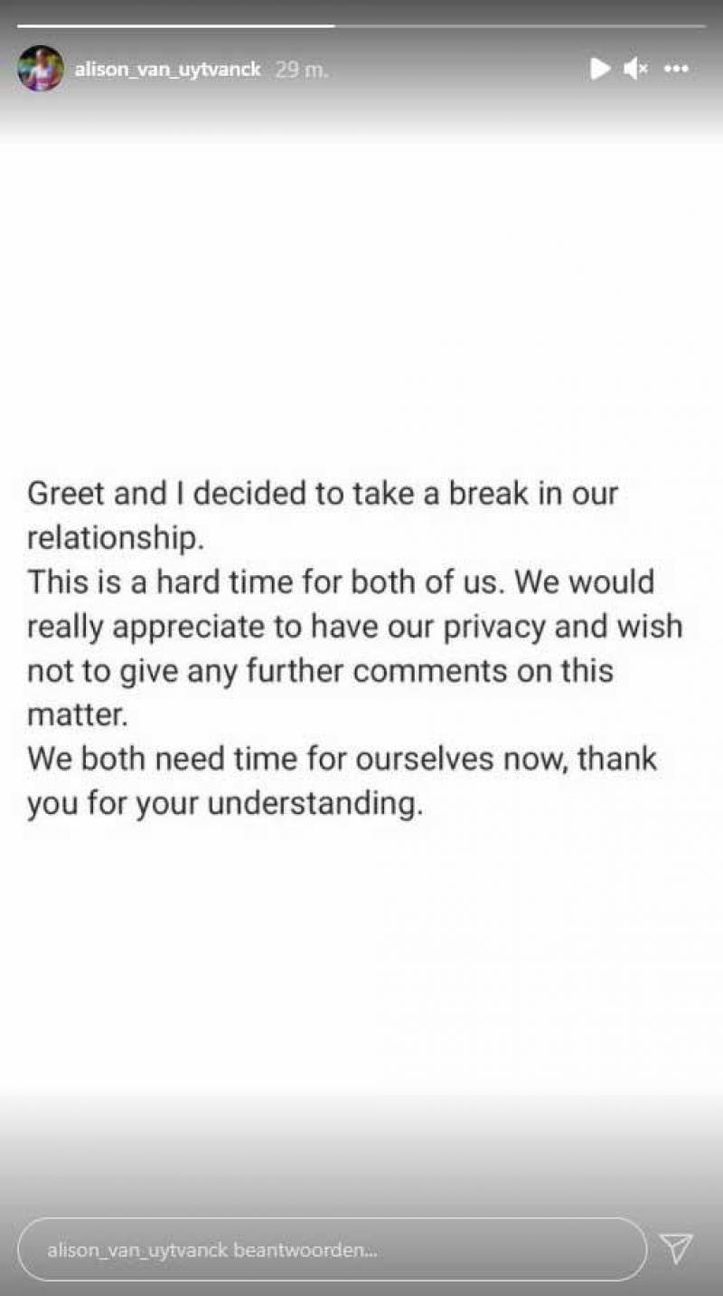 «Greet en ik hebben besloten om een pauze in te lassen in onze relatie», schrijft Van Uytvanck. «Dit is moeilijk voor ons allebei. We zouden het appreciëren als onze privacy gerespecteerd wordt en zullen verder geen commentaar geven. We hebben allebei tijd voor onszelf nodig. Bedankt voor het begrip», klinkt het.