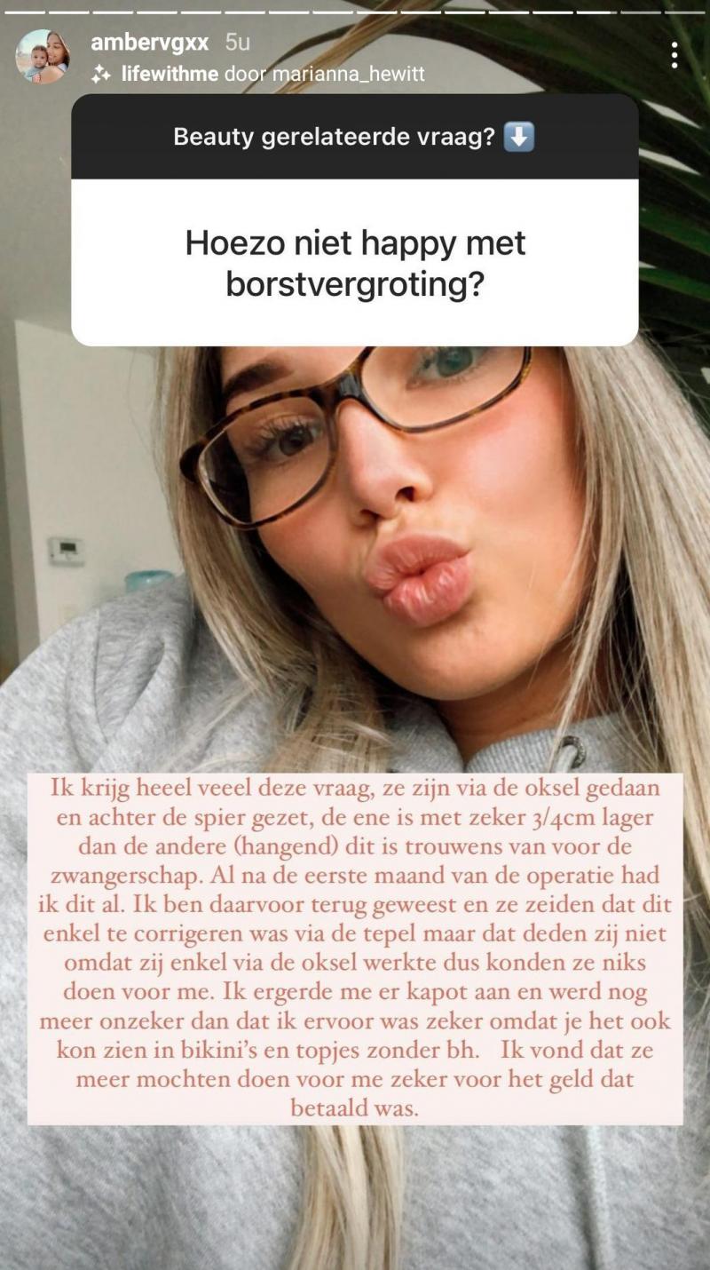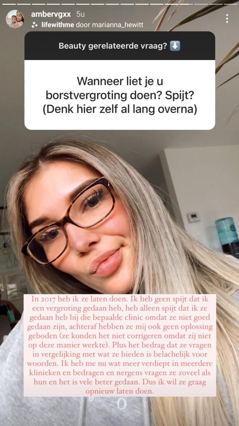 Amber nam vorig jaar als verleidster deel aan het populaire verleidingsprogramma. Daar leerde ze Arda kennen, de man waarmee ze nu een kindje heeft. De 23-jarige brunette onderging in 2017 een borstvergroting omdat ze onzeker was over de grootte van haar boezem. Spijt van die beslissing heeft ze niet, al is ze niet tevreden met het resultaat. «Ik heb geen spijt dat ik een borstvergroting gedaan heb, wel dat ik ze bij een bepaalde kliniek heb laten doen. Ze hebben het immers niet goed gedaan en het was bovendien duurder dan bij andere klinieken. Dus ik wil ze graag opnieuw laten doen», vertelt ze op Instagram.