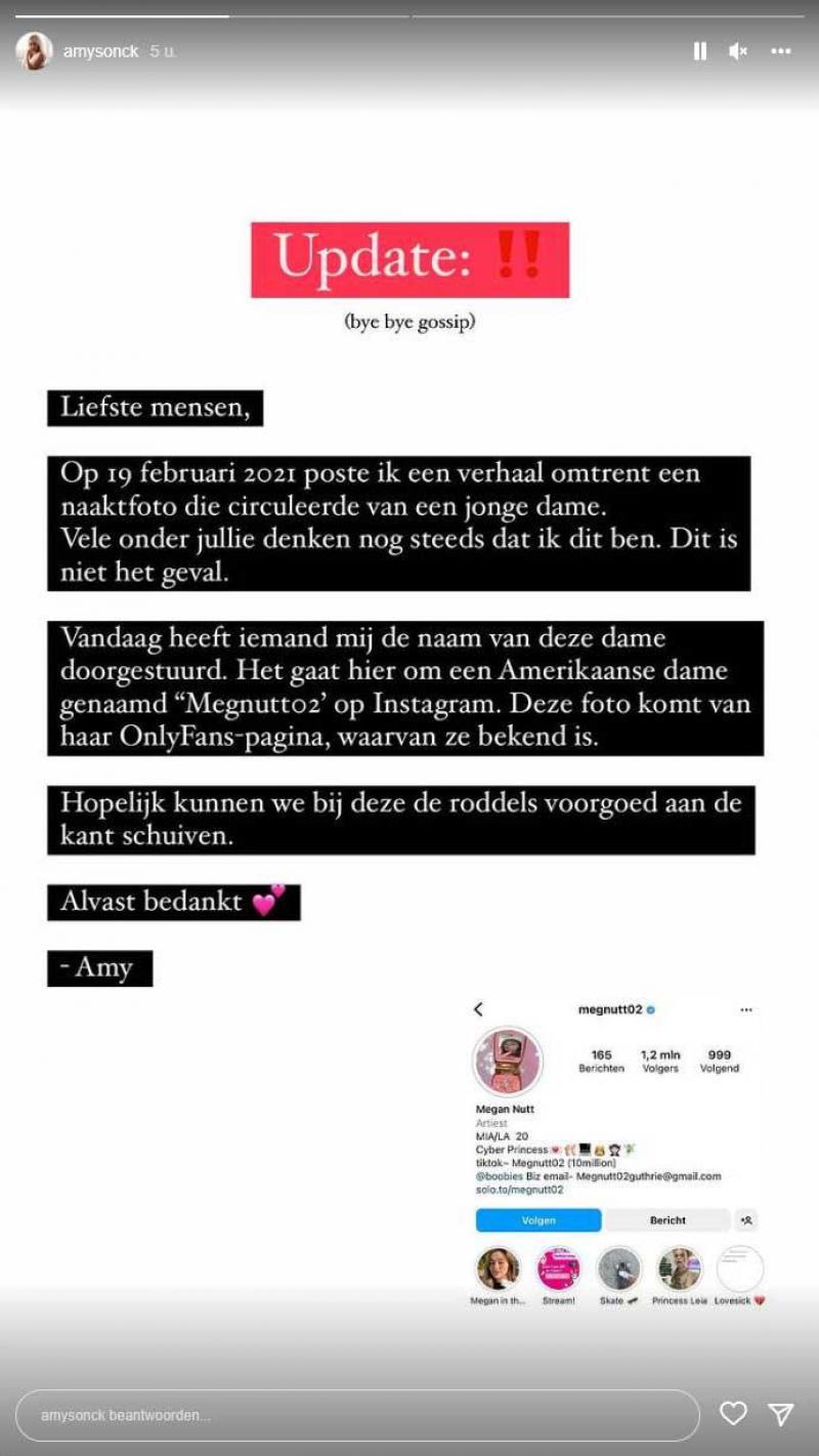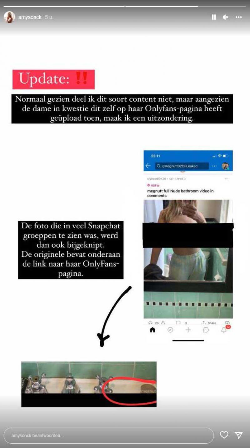 De 21-jarige studente bedrijfsmanagement uit Aalst schrijft op Instagram immers dat ze te weten is gekomen wie de vrouw in kwestie is. «Op 19 februari 2021 postte ik een verhaal omtrent een naaktfoto die circuleerde van een jongedame. Velen onder jullie denken nog steeds dat ik dit ben. Dit is niet het geval. Vandaag heeft iemand mij de naam van deze dame doorgestuurd. Het gaat hier om een Amerikaanse dame, genaamd ‘megnutt02’ op Instagram. Deze foto komt van haar OnlyFans-pagina, waarvan ze bekend is. Hopelijk kunnen we bij deze de roddels voorgoed aan de kant schuiven», klinkt het.