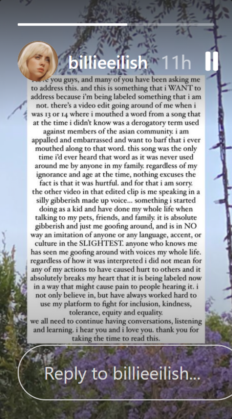 Een reactie van Eilish zelf liet niet lang op zich wachten. Op haar Instagram Stories pende de zangeres dinsdag een uitgebreide verontschuldiging neer. «Velen van jullie hebben me gevraagd hierop te reageren en dat wil ik doen, want ik word neergezet als iemand die ik niet ben», steekt ze van wal. «Ik was toen 13 of 14 en op dat moment wist ik niet dat het een beledigende uitdrukking was voor mensen uit de Aziatische gemeenschap. Ik ben geschokt en beschaamd en moet ervan kotsen dat ik dat woord ooit heb geplaybackt. Ik had voor dit liedje nog nooit van dat woord gehoord. Ongeacht mijn onwetendheid en leeftijd toen, is er geen excuus voor het feit dat dit kwetsend was. En dat spijt me.»