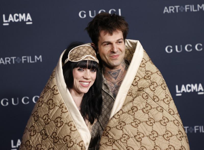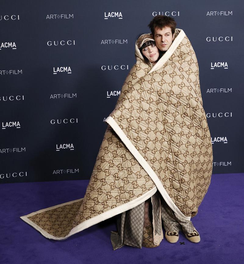 Zaterdagavond daagden Rutherford en Eilish samen op in een Gucci-pak op de rode loper. Ze waren beiden gewikkeld in een gigantisch deken in de print van het Italiaanse merk. Daaronder droegen ze een bij elkaar horende pyjamaset: Eilish droeg een slipdress, Rutherford een zijden pyjama. Ze hadden het duidelijk naar hun zin, en lachten breed naar de camera.