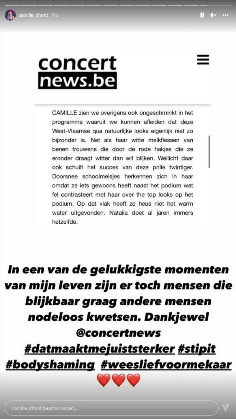 Camille, die met ‘Diamant’ overigens het themalied van de STIP-actie tegen pesten naar buiten bracht, uitte op sociale media haar ongenoegen over die passage. «In één van de gelukkigste momenten van mijn leven zijn er toch mensen die blijkbaar graag andere mensen nodeloos kwetsen. Dankjewel, Concertnews.be. #bodyshaming #nietleuk», schrijft ze op Instagram en Twitter.