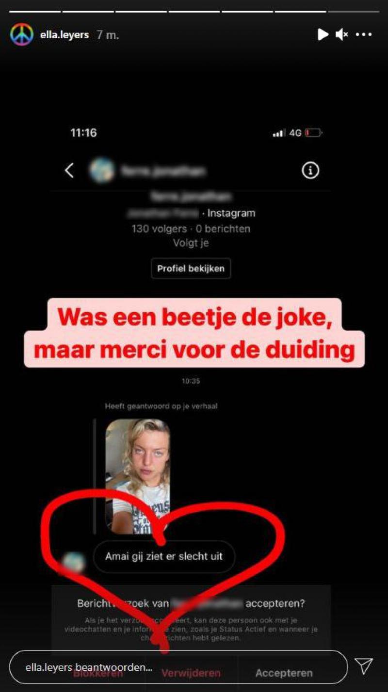 Ella Leyers deelde onlangs een foto op Instagram waarop ze bewust niet stralend poseert. Een volger kon het niet laten om haar daarop te wijzen. «Amai, gij ziet er slecht uit», schreef hij.
