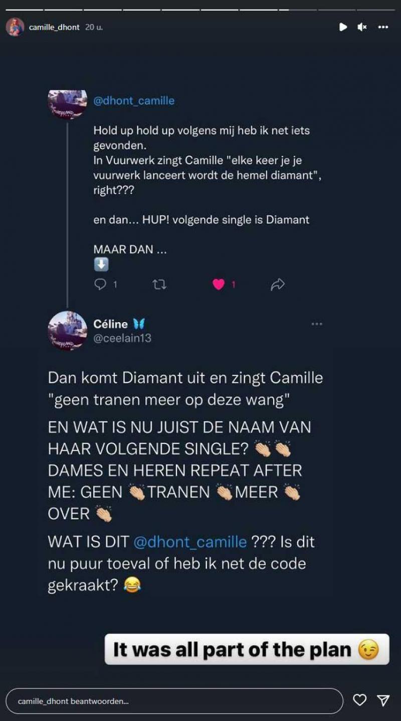 Camille kwam de tweet tegen en reageerde heel kort. « It was all part of the plan», knipoogt ze. We zijn nu al benieuwd naar de titel van het liedje daarna...