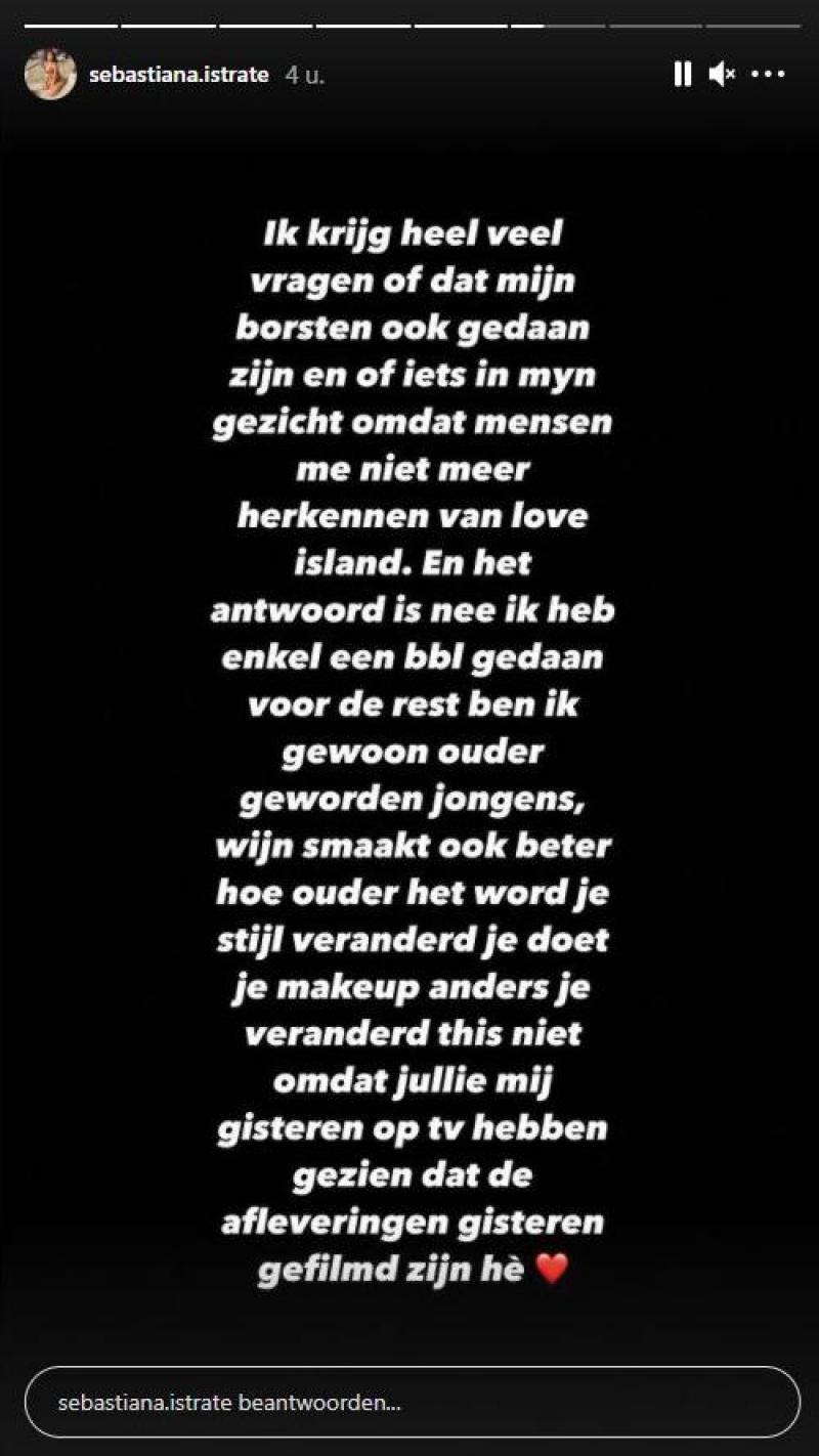 Nu krijgt ze vaak de vraag of ze nog meer aan haar lichaam heeft laten doen, bijvoorbeeld aan haar borsten of haar gezicht. Fans vinden immers dat ze er anders uitziet dan twee jaar geleden. Daar geeft ze nu een antwoord op. «Ik krijg heel veel vragen over of mijn borsten ook gedaan zijn of iets in mijn gezicht omdat mensen me niet meer herkennen van ‘Love Island’. Het antwoord is: nee. Ik heb enkel een Brazilian Butt Lift gedaan. Voor de rest ben ik gewoon wat ouder geworden, jongens. Wijn smaakt ook beter hoe ouder het wordt. Je stijl verandert, je doet je make-up anders, je verandert... Het is niet omdat jullie mij gisteren op tv hebben gezien dat de afleveringen gisteren gefilmd zijn», verduidelijkt ze op Instagram.