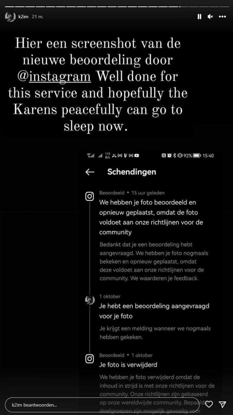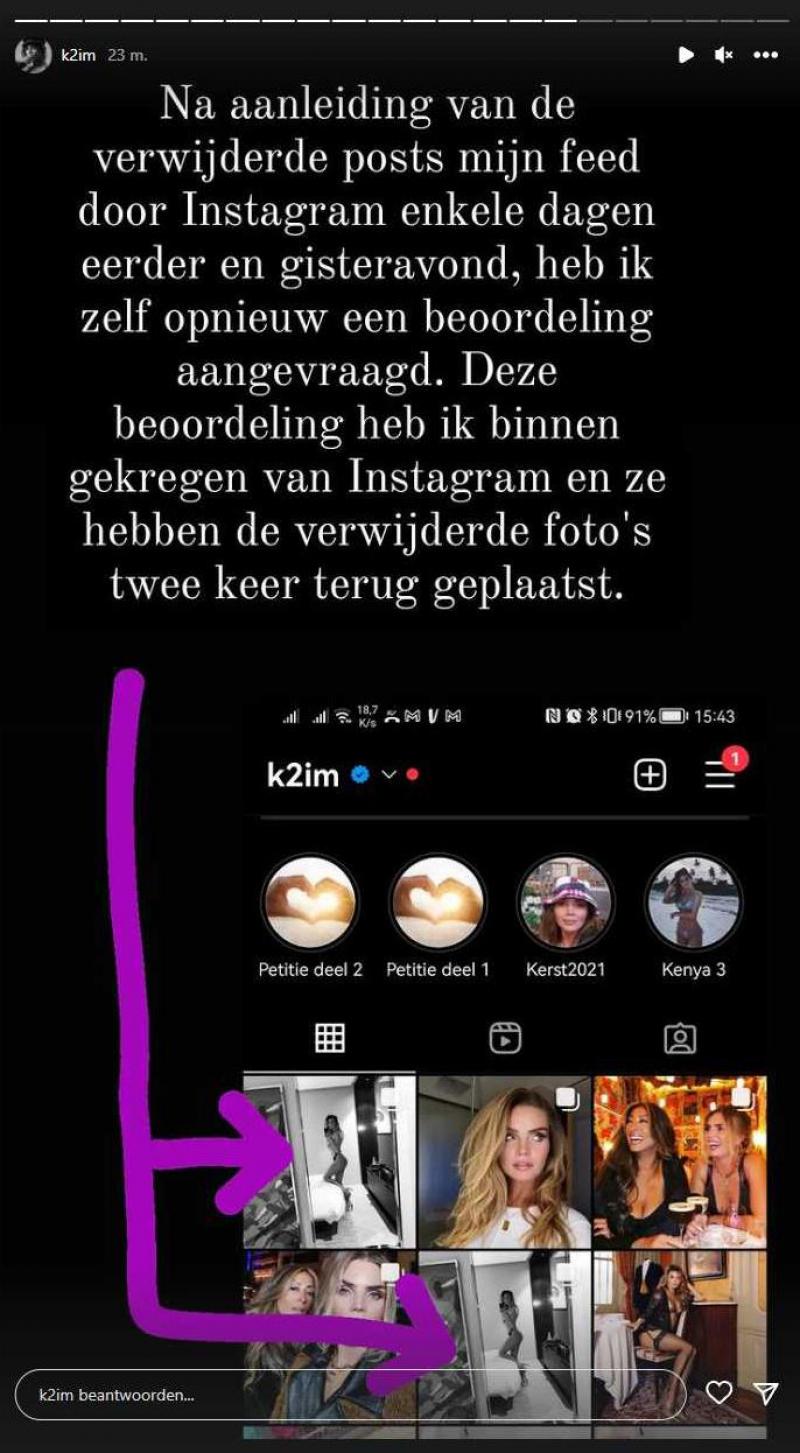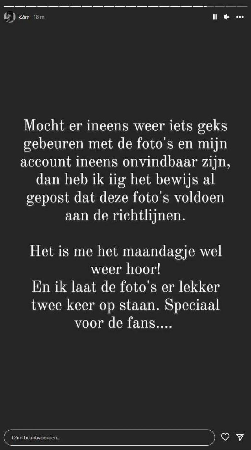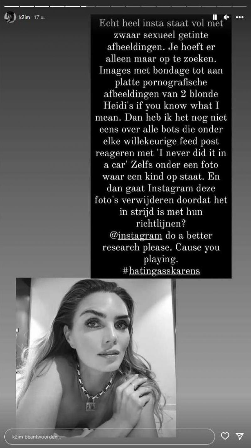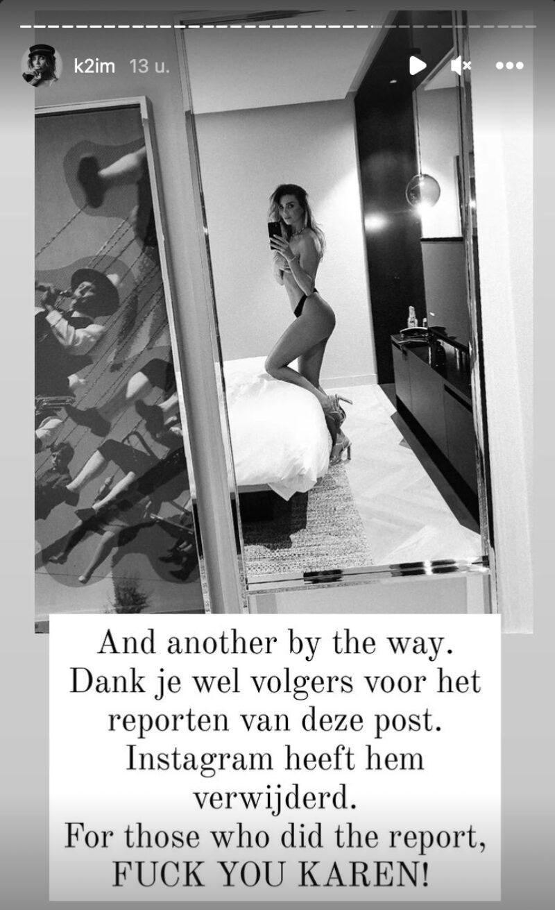 Afgelopen vrijdag deelde Kim Feenstra enkele foto’s waarop ze halfnaakt poseert in een hotelkamer. Ze bedekt weliswaar haar boezem, maar toch vonden meerdere mensen hem blijkbaar ongepast. «Dankjewel volgers voor het reporten van deze post. Instagram heeft hem verwijderd», zuchtte ze in haar Stories.