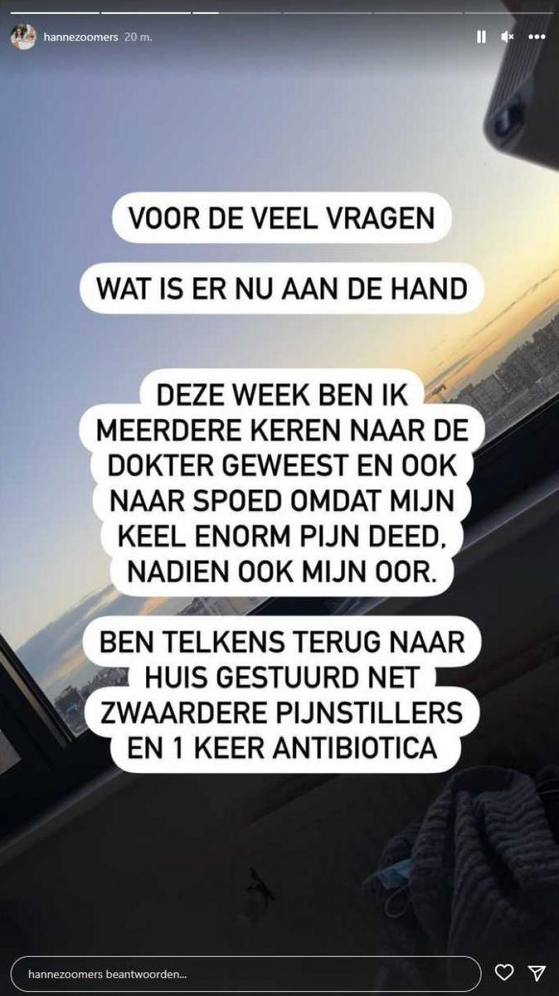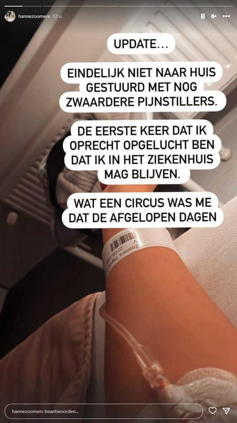 De volgers van Hanne Zoomers kregen gisterenavond een verontrustend bericht te zien op haar Instagram. Ze bleek immers in het ziekenhuis te liggen. «Eindelijk niet naar huis gestuurd met nog zwaardere pijnstillers. De eerste keer dat ik oprecht opgelucht ben dat ik in het ziekenhuis mag blijven. Wat een circus was me dat de afgelopen dagen», schrijft Hanne.