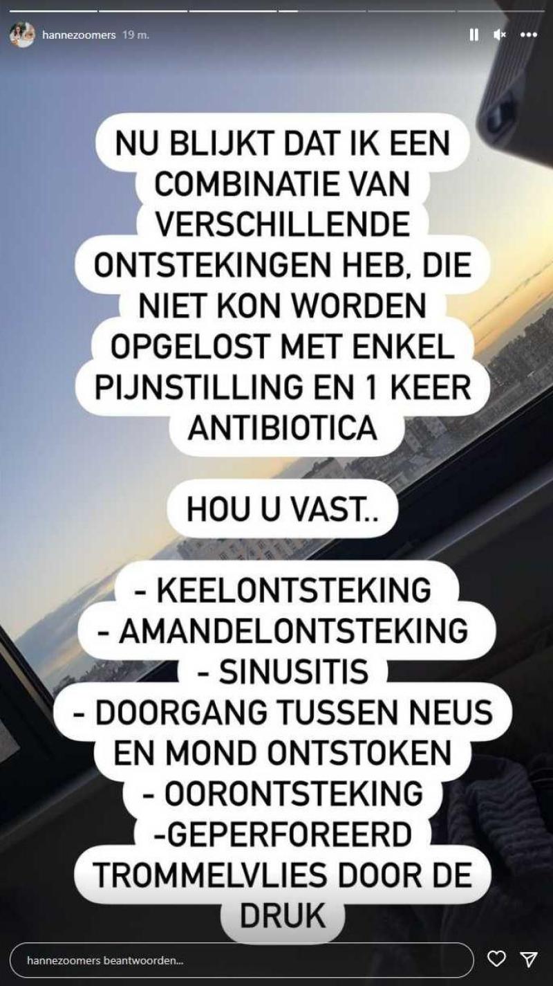 Vervolgens somt ze maar liefst zes verschillende kwaaltjes op. «Keelontsteking, amandelontsteking, sinusitis, doorgang tussen neus en mond ontstoken, oorontsteking, en geperforeerd trommelvlies door de druk. De paniek begon gisteren toch door te slaan toen er letterlijk plasjes bloed uit mijn oor begonnen te komen. Ik ben bijna nooit ziek, maar duidelijk wel serieus als dat het geval is», luidt het.