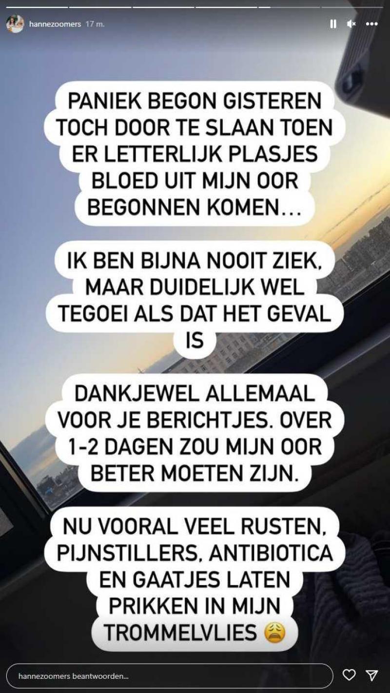Gelukkig mag ze normaal gezien binnen enkele dagen alweer naar huis. «Dankjewel allemaal voor de berichtjes. Over één à twee dagen zou mijn oor beter moeten zijn. Nu vooral veel rusten, pijnstillers, antibiotica, en gaatjes laten prikken in mijn trommelvlies», besluit ze.