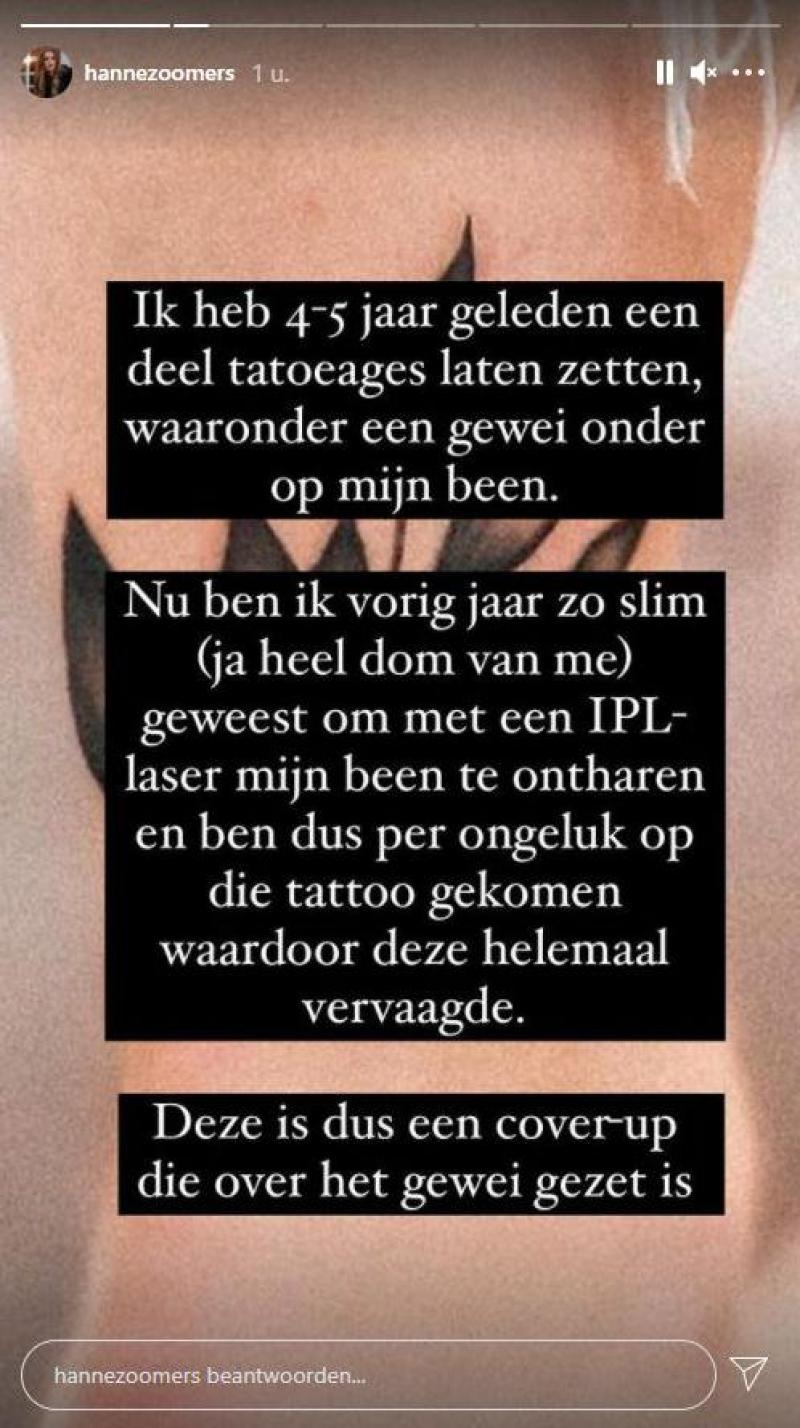 Ze kreeg heel wat vragen van volgers daarover. “Voor de mensen die vragen waarom ik plots een tattoo liet zetten: ik heb 4-5 jaar geleden enkele tatoeages laten zetten, waaronder een gewei aan de onderkant van mijn been. Nu ben ik vorig jaar zo slim (ja, heel dom van me) geweest om met een IPL-laser mijn been te ontharen en ben dus per ongeluk op die tattoo gekomen waardoor ze helemaal vervaagde. Deze is dus een cover-up die over het gewei gezet is”, vertelt ze op Instagram.