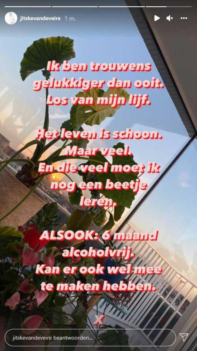 Ze benadrukt dat ze ondanks die hindernissen allesbehalve ongelukkig is. «Ik ben trouwens gelukkiger dan ooit. Los van mijn lijf. Het leven is schoon. Maar veel. En die veel moet ik nog een beetje leren. Alsook: zes maanden alcoholvrij. Kan er ook wel mee te maken hebben», besluit ze.