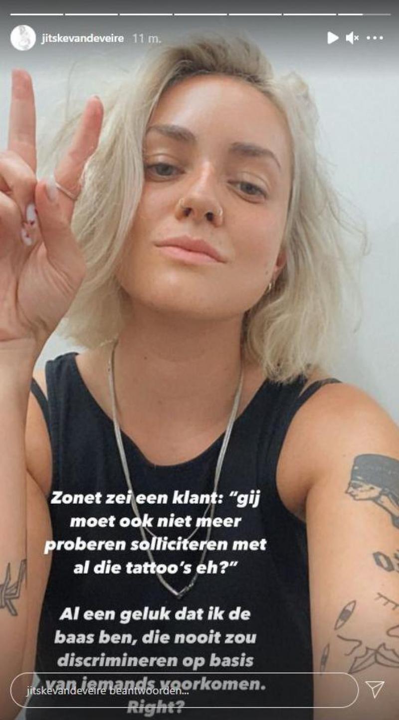 Een klant gaf daar vandaag tijdens een knipsessie bedenkelijk commentaar op, al liet Jitske zijn uitspraak niet zomaar passeren. «Zonet zei een klant: ‘gij moet ook niet meer proberen solliciteren met al die tattoos, hè?’. Al een geluk dat ik de baas ben die nooit zou discrimineren op basis van iemands voorkomen, right?», schrijft ze op Instagram.