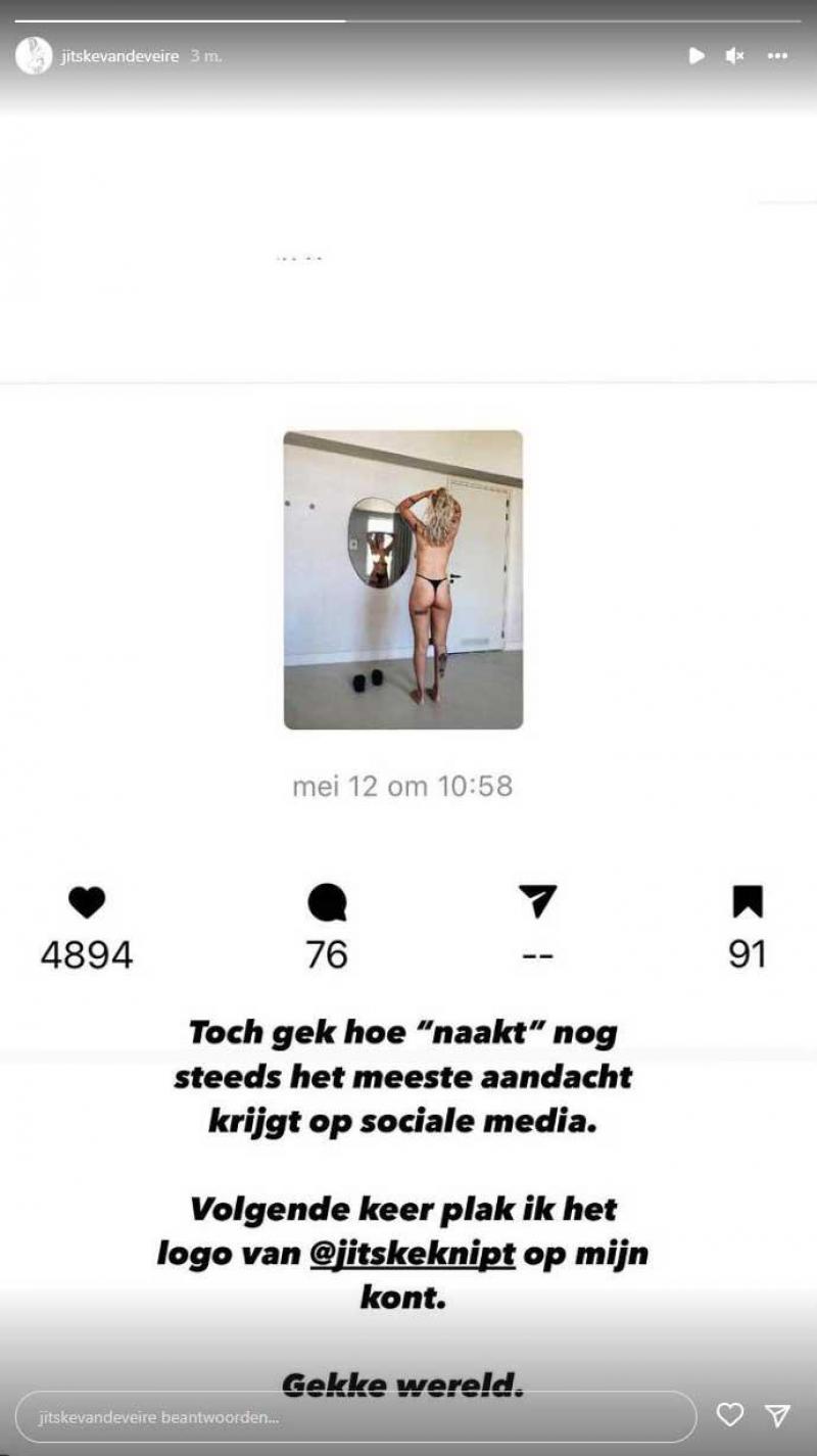 De 28-jarige eigenares van kapperszaak Wakko én woordvoerster van ‘Wel Jong’ deelde gisteren een kiekje waarop ze voor de spiegel poseert met enkel een slipje aan. In geen tijd kreeg de foto meer dan 5.000 likes, opvallend meer dan de posts waarin ze minder de nadruk op haar lichaam legt. «Toch gek hoe ‘naakt’ nog steeds het meeste aandacht krijgt op sociale media. Volgende keer plak ik het logo van ‘Jitske knipt’ op mijn kont. Gekke wereld», schrijft ze erbij.