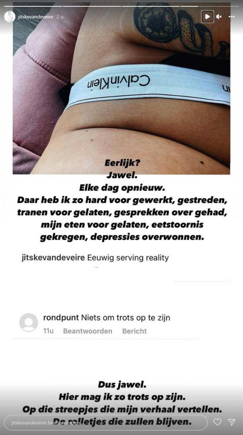 Een enkeling reageerde echter als volgt: «Niets om trots op te zijn». De 28-jarige eigenares van kapperszaak Wakko én woordvoerster van ‘Wel Jong’ nam de tijd om daar een gepast antwoord op te geven. «Eerlijk? Jawel. Elke dag opnieuw. Daar heb ik zo hard voor gewerkt, gestreden, tranen voor gelaten, gesprekken over gehad, mijn eten voor gelaten, eetstoornis gekregen, depressies overwonnen. Dus jawel. Hier mag ik zo trots op zijn. Op die streepjes die mijn verhaal vertellen. De rolletjes die zullen blijven», schrijft ze.