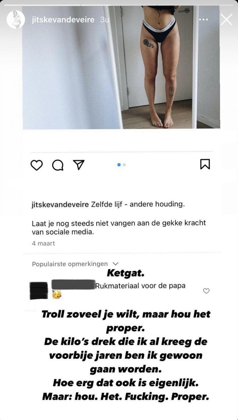 Jitske zet zich dagelijks in voor body positivity. Begin deze maand deelde ze twee foto’s waarop ze aantoonde dat sociale media een vertekend beeld kunnen geven van de realiteit. Naast veel lovende reacties kreeg ze ook veel commentaar onder haar posts. «Rukmateriaal voor de papa», reageerde een Instagramgebruiker onder haar foto’s, een duidelijke uithaal naar het Eveline-schandaal waarmee Peter Van de Veire in 2020 in opspraak kwam. Dat liet ze niet zomaar voorbijgaan.