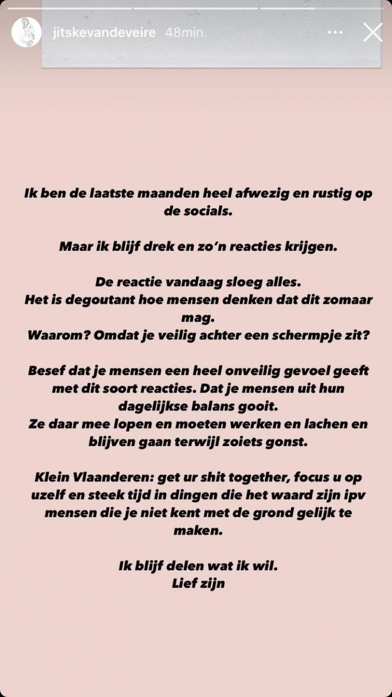 In een tweede Instagram Story deelde ze hoe zulke reacties haar beïnvloeden: «Besef dat je mensen een heel onveilig gevoel geeft met dit soort reacties. Dat je mensen uit hun dagelijkse balans gooit. Klein Vlaanderen: get ur shit together, focus u op uzelf en steek tijd in dingen die het waard zijn in plaats van mensen die je niet kent met de grond gelijk te maken.» Jitske laat de reacties niet verder aan haar hart komen en blijft delen wat ze wil. Ze vraagt haar volgers uiteindelijk ook om lief te zijn.