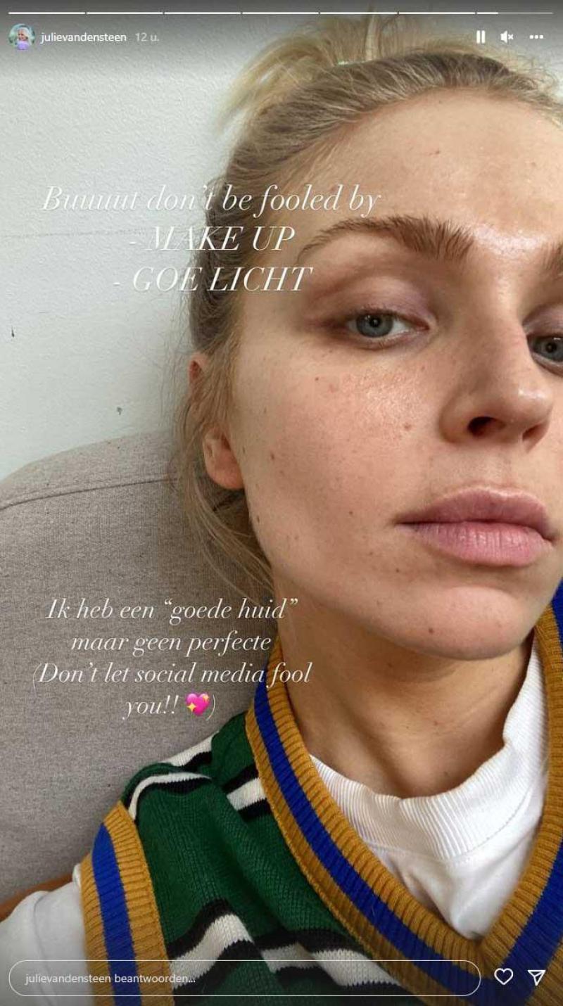 ‘The Masked Singer’-jurylid Julie Van den Steen (29) deelde vandaag een onopgemaakte foto om duidelijk te maken dat mensen op social media er met make-up en goede belichting veel beter kunnen uitzien dan ze in werkelijkheid zijn. «Ik heb een ‘goede huid’, maar geen perfecte. Laat je niet misleiden door social media», waarschuwt ze.