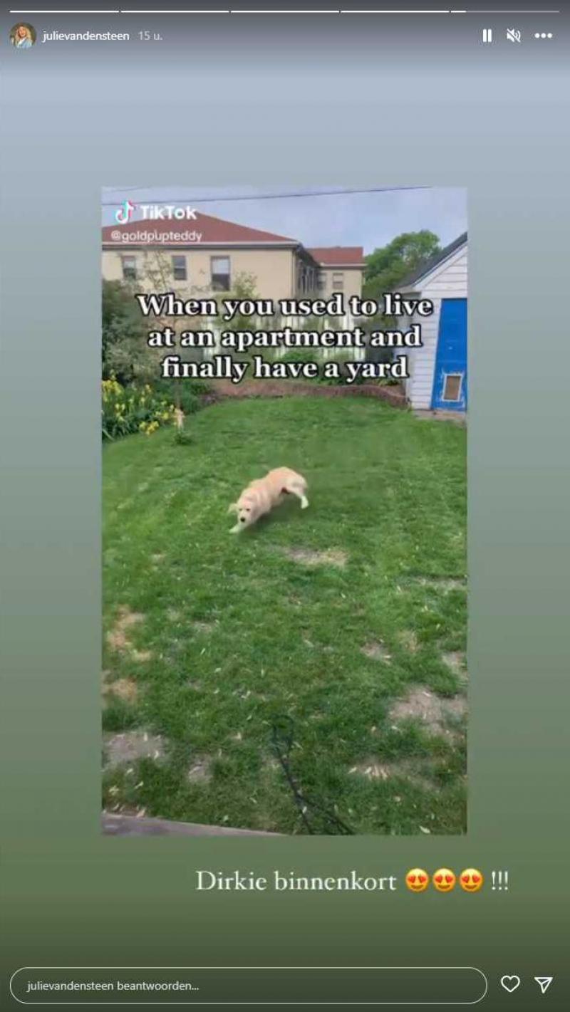 Ze vraagt aan haar volgers ook meteen enkele tips omtrent renovatie en interieur. Gelukkig staat ze er niet alleen voor: ook haar hond, een labradoodle die luistert naar de naam Dirk, verhuist mee. En blij dat hij zal zijn nu hij eindelijk een eigen tuin heeft...